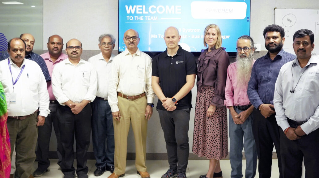 SpinChem AB expands in India through a partnership with Smart Labtech Private Ltd. SpinChem’s Emil Byström, and Tove Näsman, in the centre with Mr. Satya Prasad, CEO Smart Labtech, on their right side.